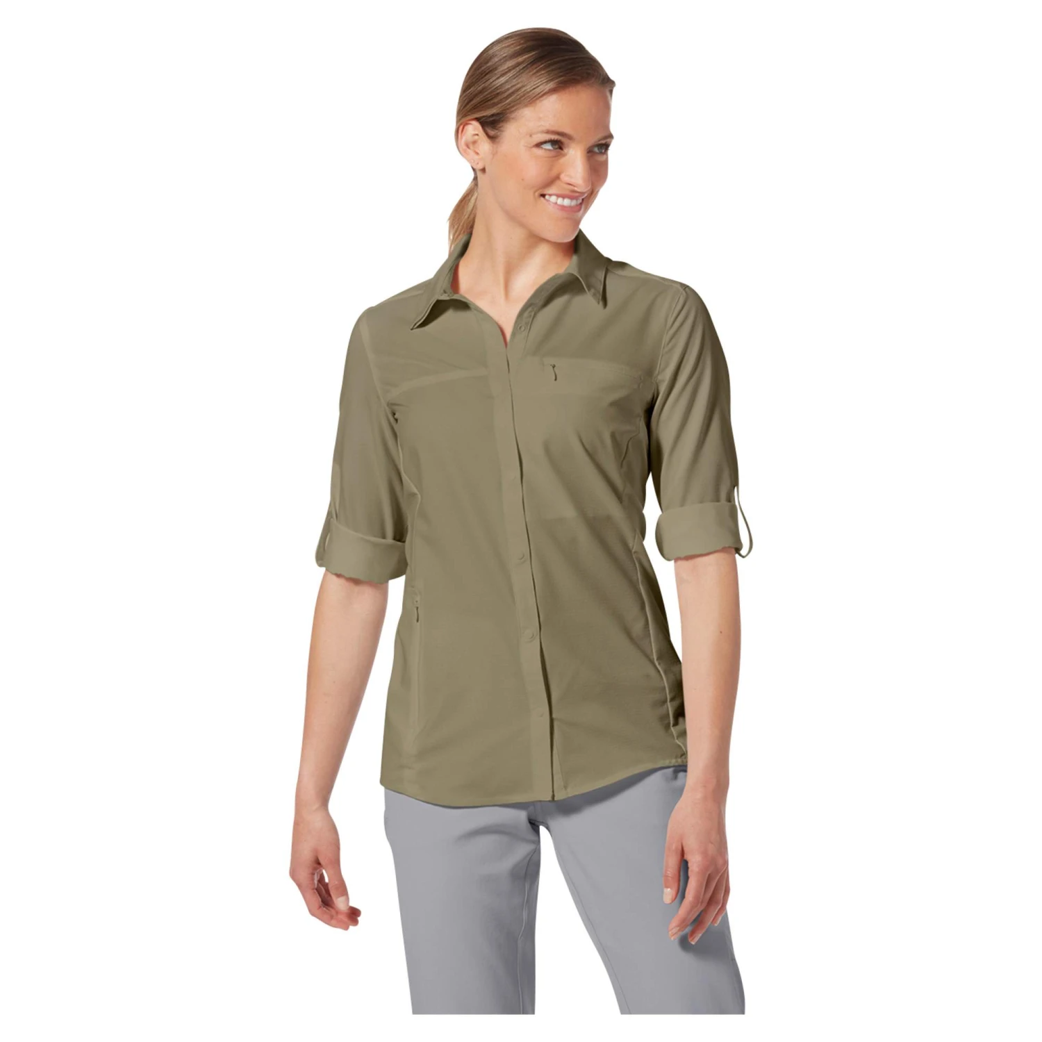Ebenfalls nicht zu vernachlässigen ist die Möglichkeit, die Ärmel aufzurollen und dann per Lasche und Knopf zu fixieren. Zweckmäßig und einfach, um zusätzlich für Lüftung zu sorgen. Unter den Achseln hat die Bluse zudem eine Belüftung.
